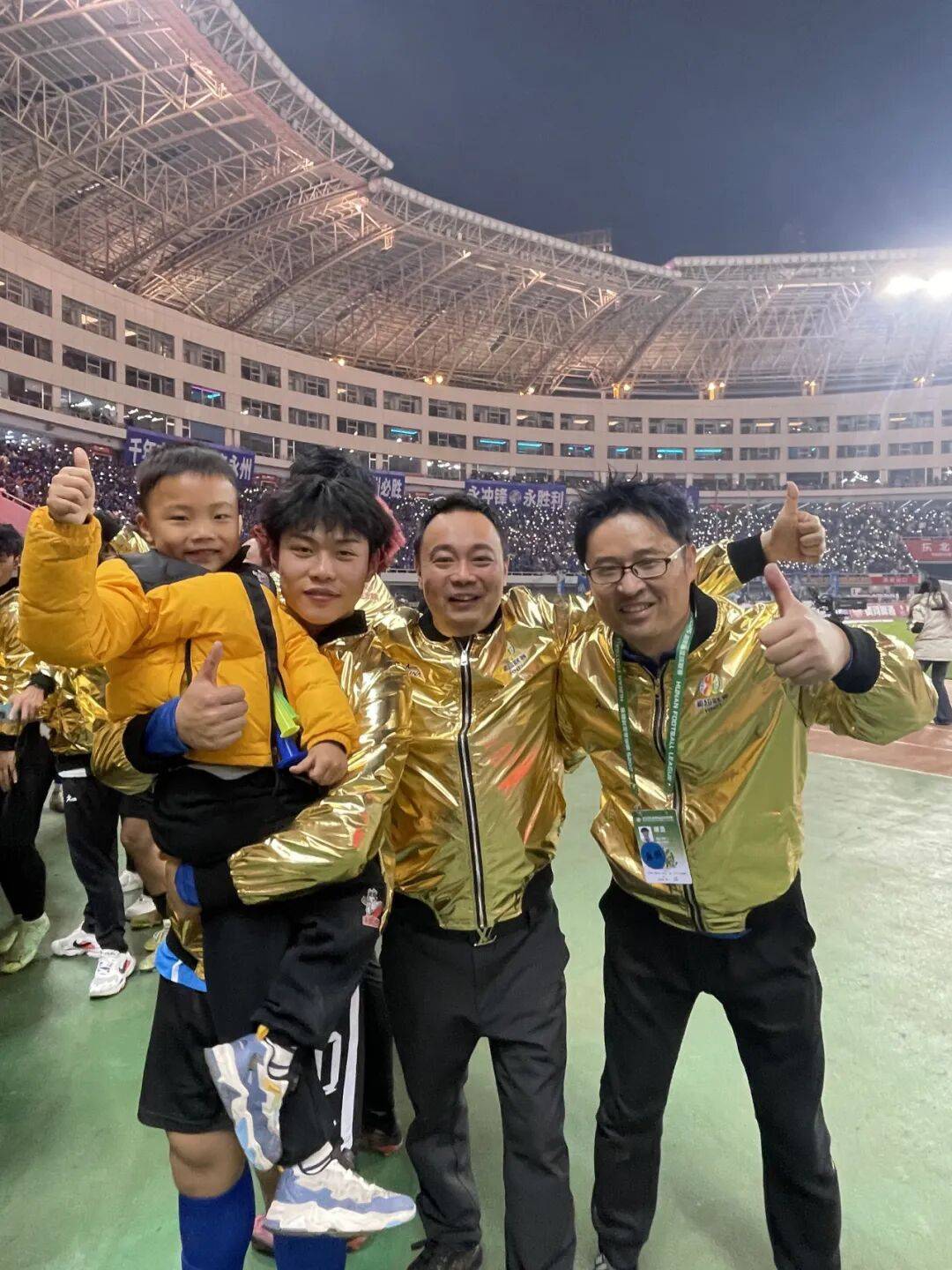长沙市政协委员、长沙腾跃足球俱乐部董事长谭迪带着年幼的儿子站在场边,见证永州队站上领奖台,捧起冠军金杯。颁奖仪式结束后,永州队20号彭玢跑向谭迪,举着自己的冠军奖牌说:“我们现在真的是冠军了!”